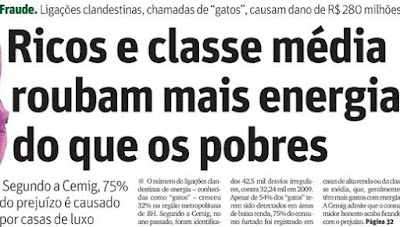O gerente de Gestão e Controle de Perdas da Cemig, Luiz Renato Fraga Rios, aponta que, embora 54% dos “gatos” tenham sido detectados em áreas de baixa renda, o maior volume de energia é furtada pelos consumidores de classes média e alta que residem em em casas de luxo e pelo comércio ou mesmo indústrias. “A quantidade de energia desviadas pelas pessoas de melhor poder aquisitivo é muito superior”, salientou Rios.http://www.otempo.com.br/otempo/